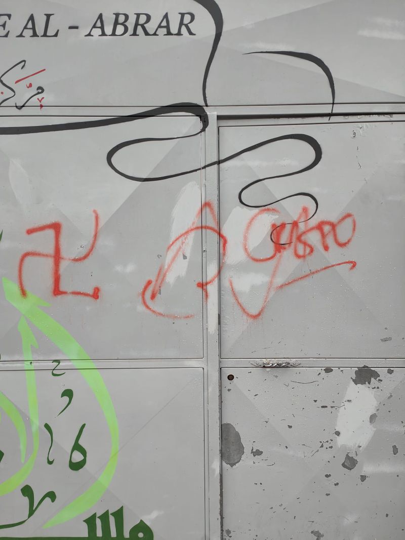 K metro 0 – Tivoli – Feroci idioti. Vandali che nascosti nel buio hanno imbrattato il cancello d’ingresso del centro culturale islamico Al Abrar di Tivoli Terme, dipingendo con vernici spray, una svastica, una croce e altre scritte incomprensibili. Un atto di empietà, di mancanza di rispetto verso una comunità e un luogo di dialogo